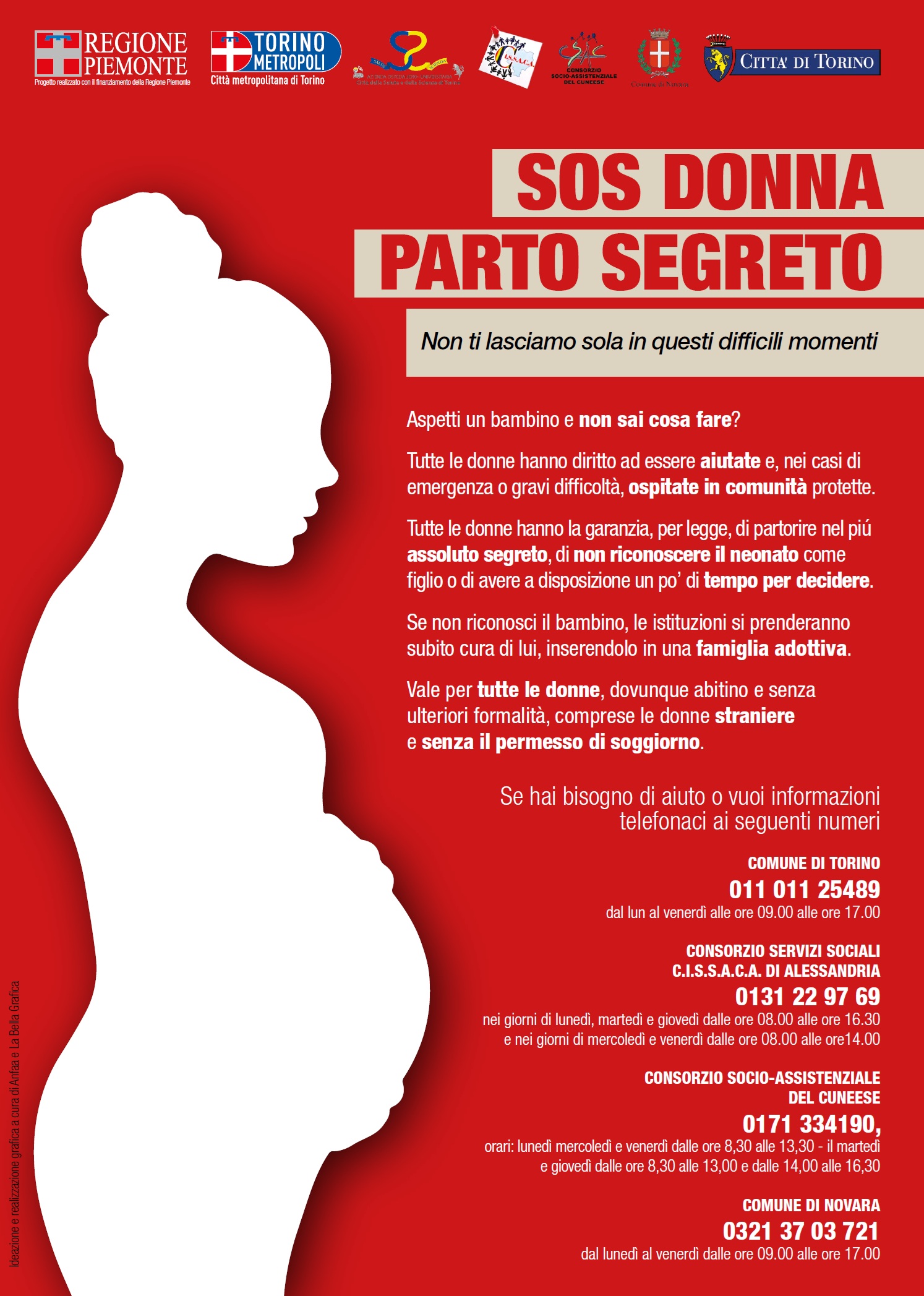 Aspetti un bambino e non sai cosa fare? Tutte le donne hanno diritto ad essere aiutate e, nei casi di emergenza o gravi difficoltà, ospitate in comunità protette. Tutte le donne hanno la garanzia, per legge, di partorire nel piú assoluto segreto, di non riconoscere il neonato come figlio o di avere a disposizione un po’ di tempo per decidere. Se non riconosci il bambino, le istituzioni si prenderanno subito cura di lui, inserendolo in una famiglia adottiva. Vale per tutte le donne, dovunque abitino e senza ulteriori formalità, comprese le donne straniere e senza il permesso di soggiorno. Consulta la locandina in italiano ed in multilingue